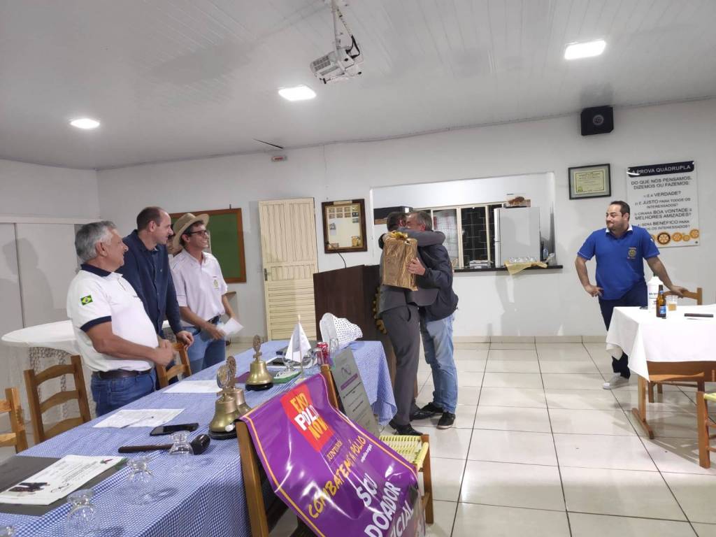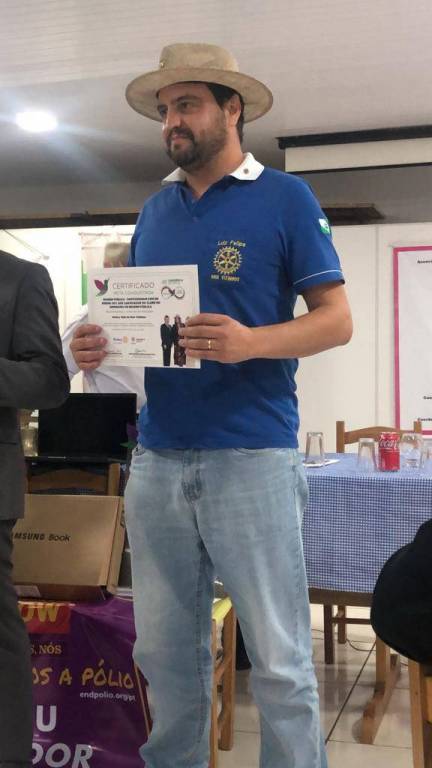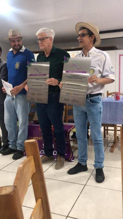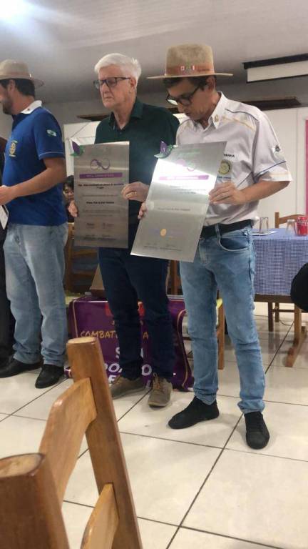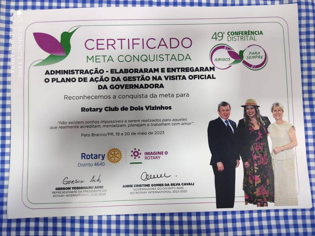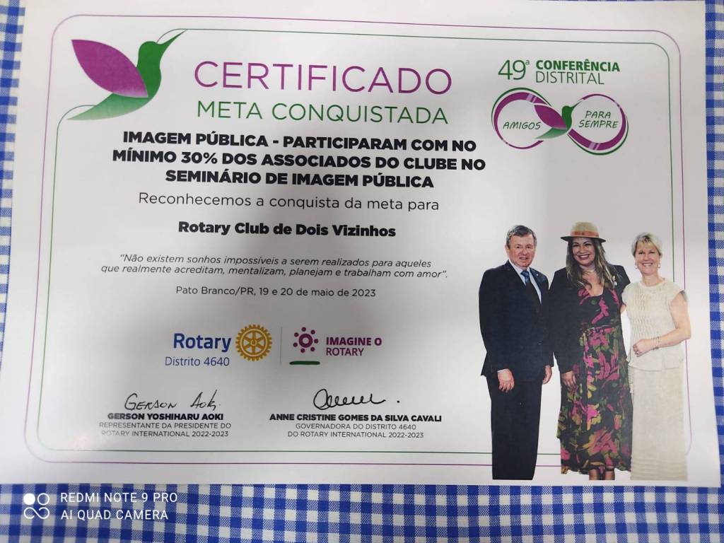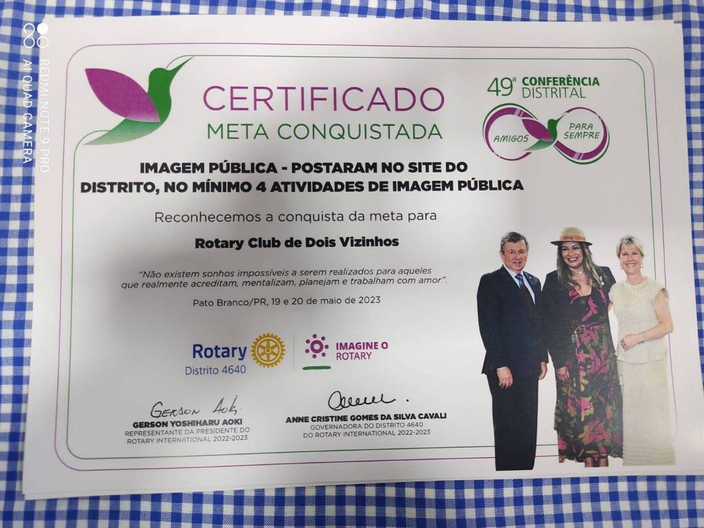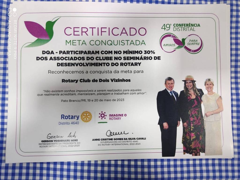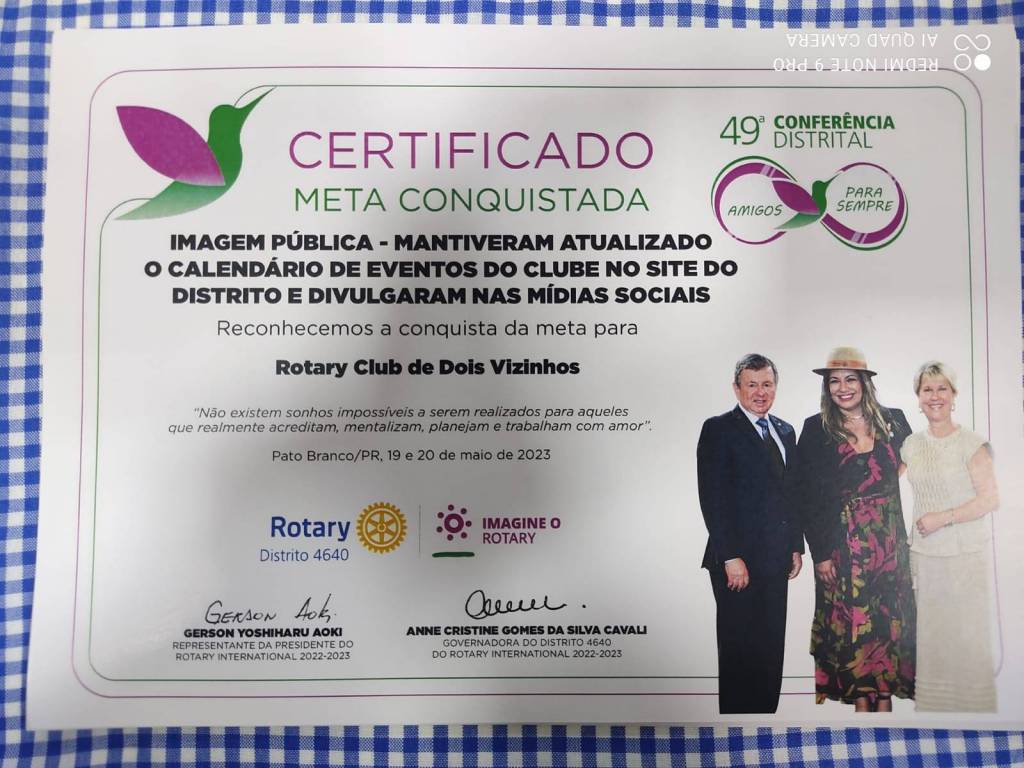 Durante a reunião ordinária e festiva dos aniversariantes, o presidente do Club Antônio Castanha, apresentou as premiações que o Rotary Club Dois Vizinhos recebeu em Pato Branco, no ultimo final de semana, quando aconteceu a Assembleia Distrital. Foram 9 conquistas por metas alcançadas, que são elas: Imagem Pública – pelas divulgações realizadas; Administração, o maior número de projetos feitos; Participação de um número expressivo de membros, em seminários; Palestra com Alumini; Admissão de 5 associação com menos de 40 anos; Elaboração e entrega do Plano de Ação, na visita oficial da Governadora; Mantiveram atualizado o Calendário de Eventos do Clube no Site do Distrito e Divulgaram nas redes sociais; Admitiram novos associados, na visita da Governadora; Participaram com no mínimo 30% dos associados no Seminário de Imagem Pública. 1º Lugar – Maior Crescimento em número de associados e Contribuição de 25 dólares percapita ao fundo Pólio Plus. O Clube ganhou também um notebook como premiação.