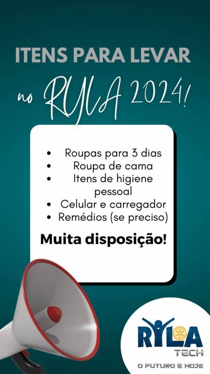 ENTRE OS DIAS 22 E 24 DE MARÇO DE 2024, OCORRERÁ O EVENTO DENOMINADO RYLA, EVENTO ESTE ORGANIZADO PELO ROTARY CLUBS E DISTRITOS, ONDE VOCÊ DESENVOLVE HABILIDADES DE LIDERANÇA, ESPÍRITO DE GRUPO, FAZ AMIZADES, ALÉM DE SE DIVERTIR. NÃO FIQUE FORA DESSA, INFORME-SE NO SEU CLUBE E PARTICIPE. É ROTARY