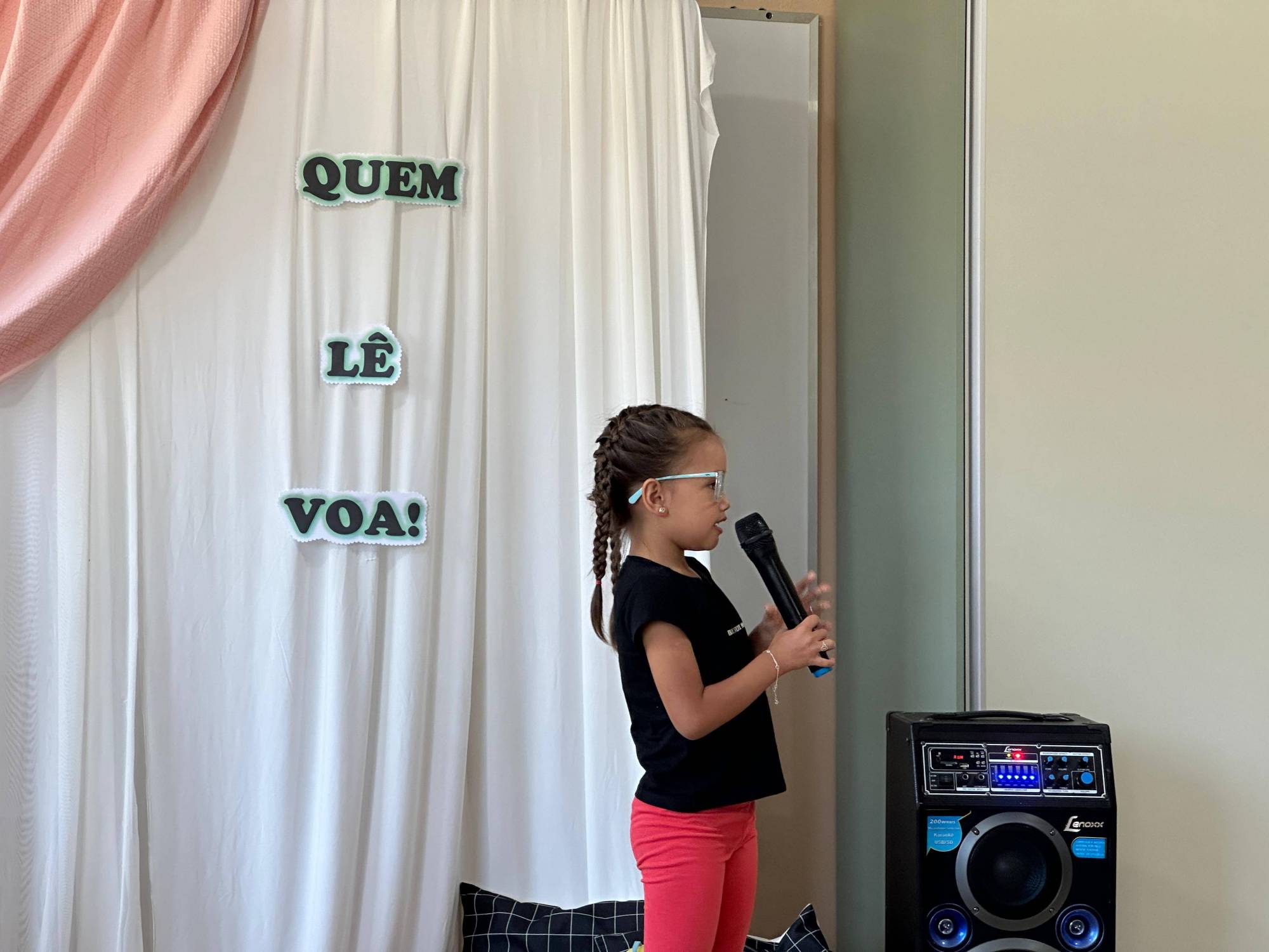 A atividade teve como objetivo incentivar a leitura e desenvolver habilidades de comunicação entre os estudantes. Cada criança escolheu um livro e preparou uma breve apresentação, narrando a trama e os personagens, além de compartilhar o que mais gostou na obra. O ambiente estava repleto de alegria e curiosidade, com os alunos demonstrando confiança ao falar em público e o prazer de contar histórias.