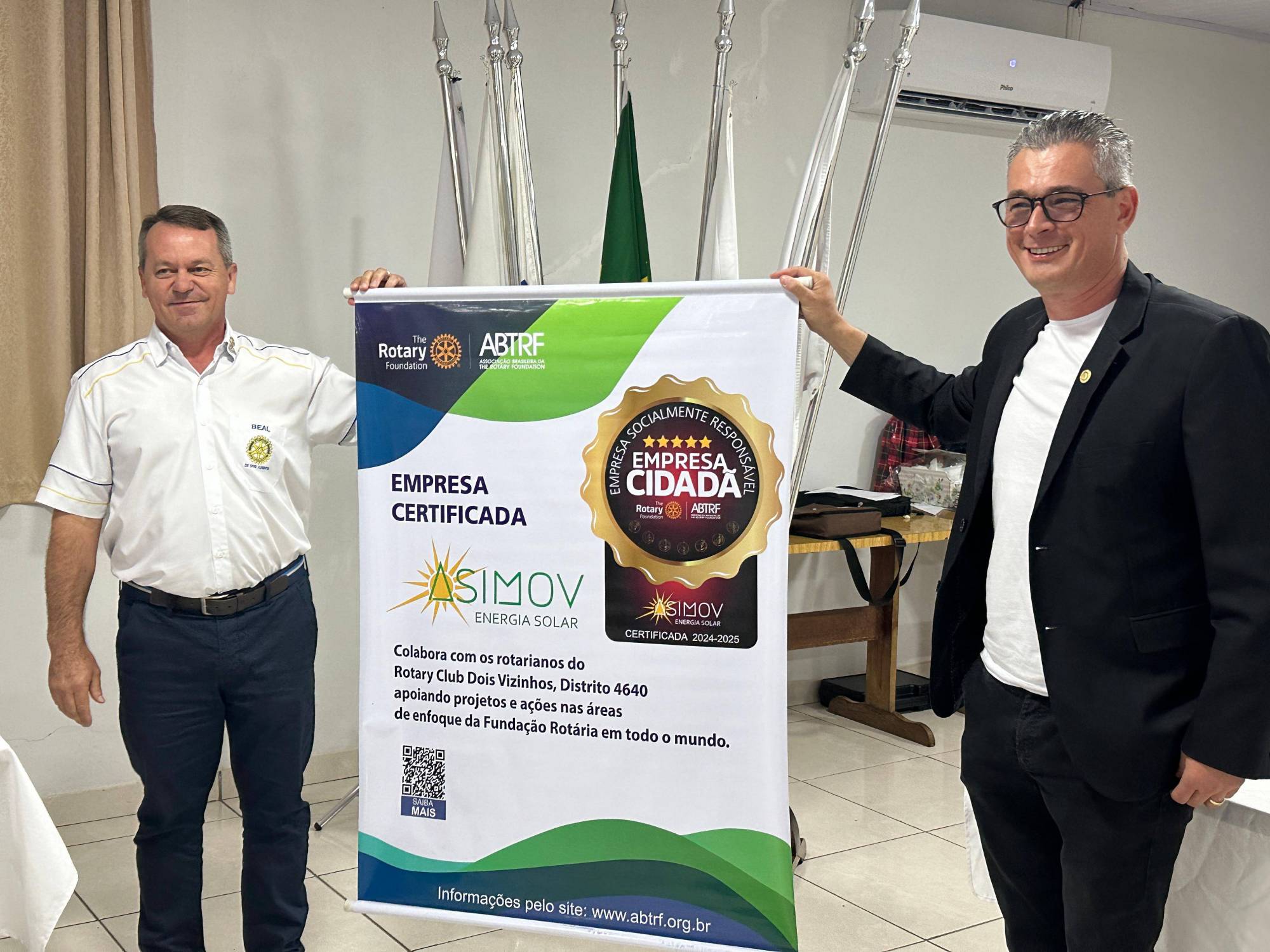 Na quinta-feira, 31 de outubro de 2024, o Rotary Club de Dois Vizinhos realizou a cerimônia de entrega do Título de Empresa Cidadã à Asimov Energia Solar, representada pelo companheiro e sócio proprietário Alex Alff. Este reconhecimento destaca o compromisso da empresa com a responsabilidade social e o desenvolvimento sustentável na região.