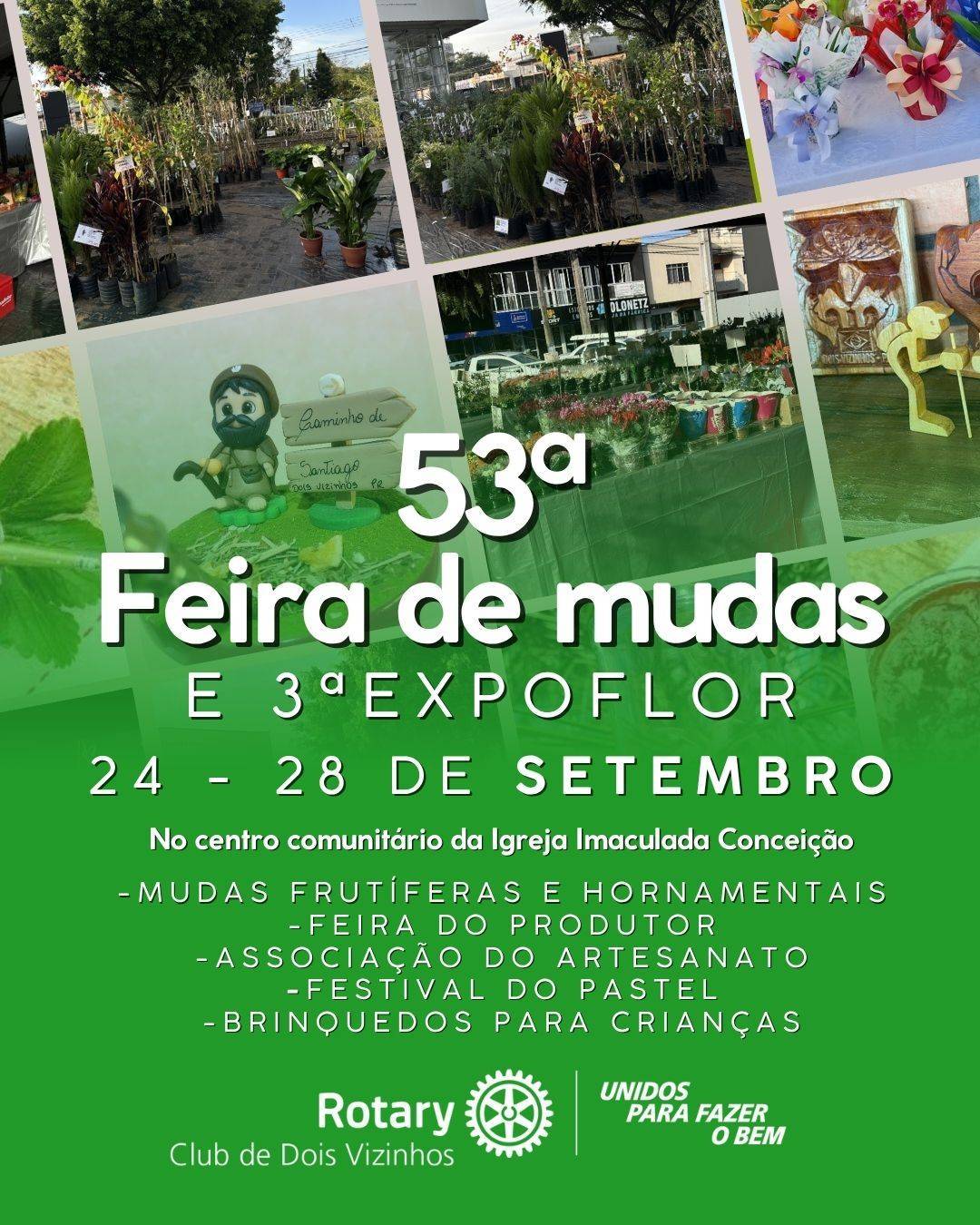 Entre os dias 24 e 28 de agosto, o Rotary Club de Dois Vizinhos realiza a 53ª Feira de Mudas e a 3ª Expo Flor, um evento que promete reunir natureza, solidariedade, cultura e gastronomia no Centro Comunitário da Igreja Imaculada Conceição.