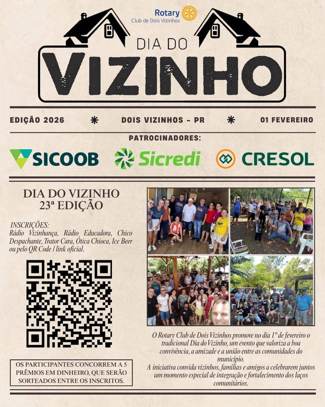 O Rotary Club de Dois Vizinhos realiza no dia 1º de fevereiro de 2026 mais uma edição do tradicional Dia do Vizinho, evento que chega à sua 23ª edição e já faz parte do calendário comunitário do município. A iniciativa tem como principal objetivo fortalecer os laços de amizade, integração e convivência entre as comunidades de Dois Vizinhos, valorizando o espírito de união e solidariedade entre os vizinhos.